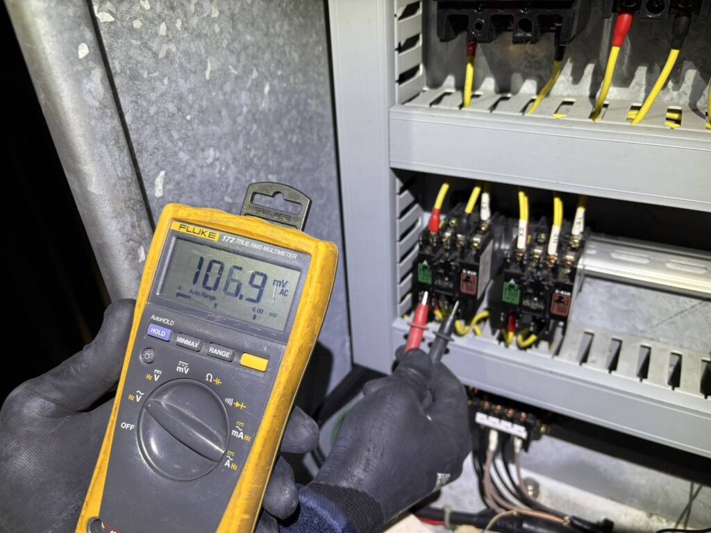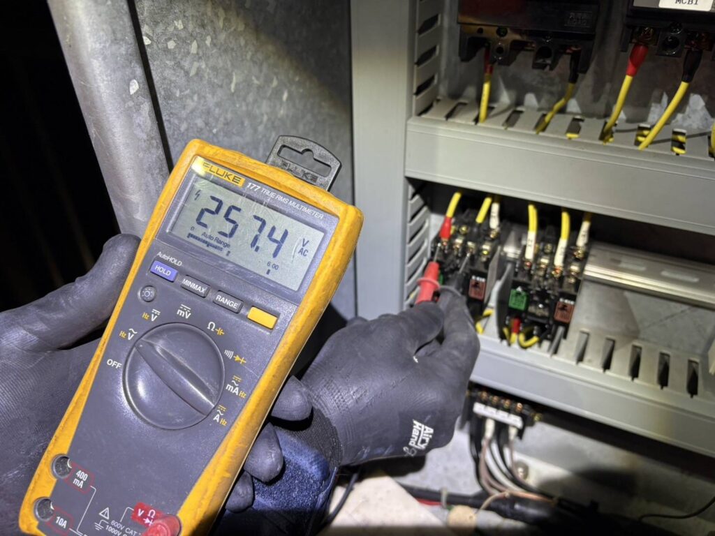 電気室から現地盤までのMCB一次側電圧を測定すると、定格電圧を確認。